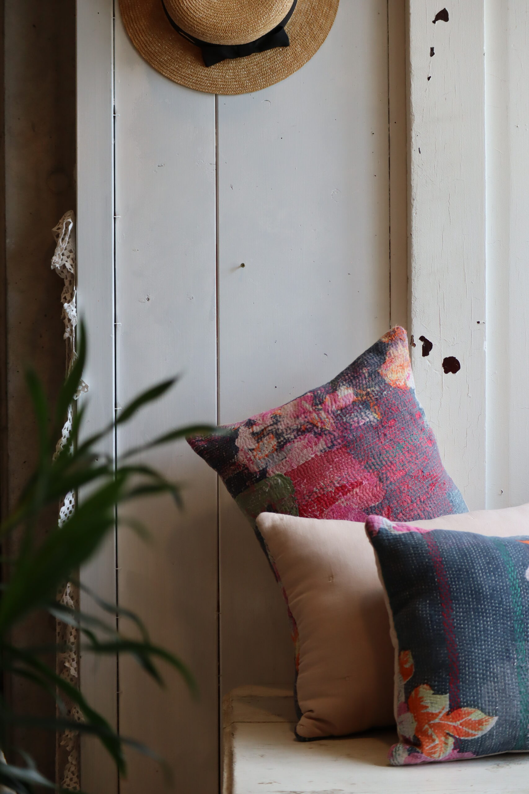 インドはベンガル地方に古くから伝わる伝統技法、KANTHA。古布を繋ぎ合わせ完成させた大判の布はタフで機能的。そんな魅力的な古布でオリジナルクッションを作りました。