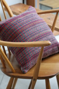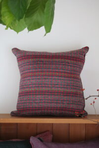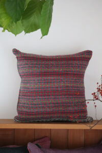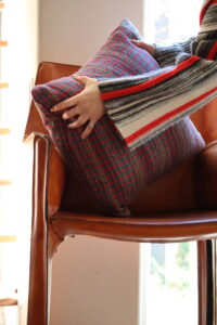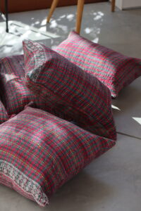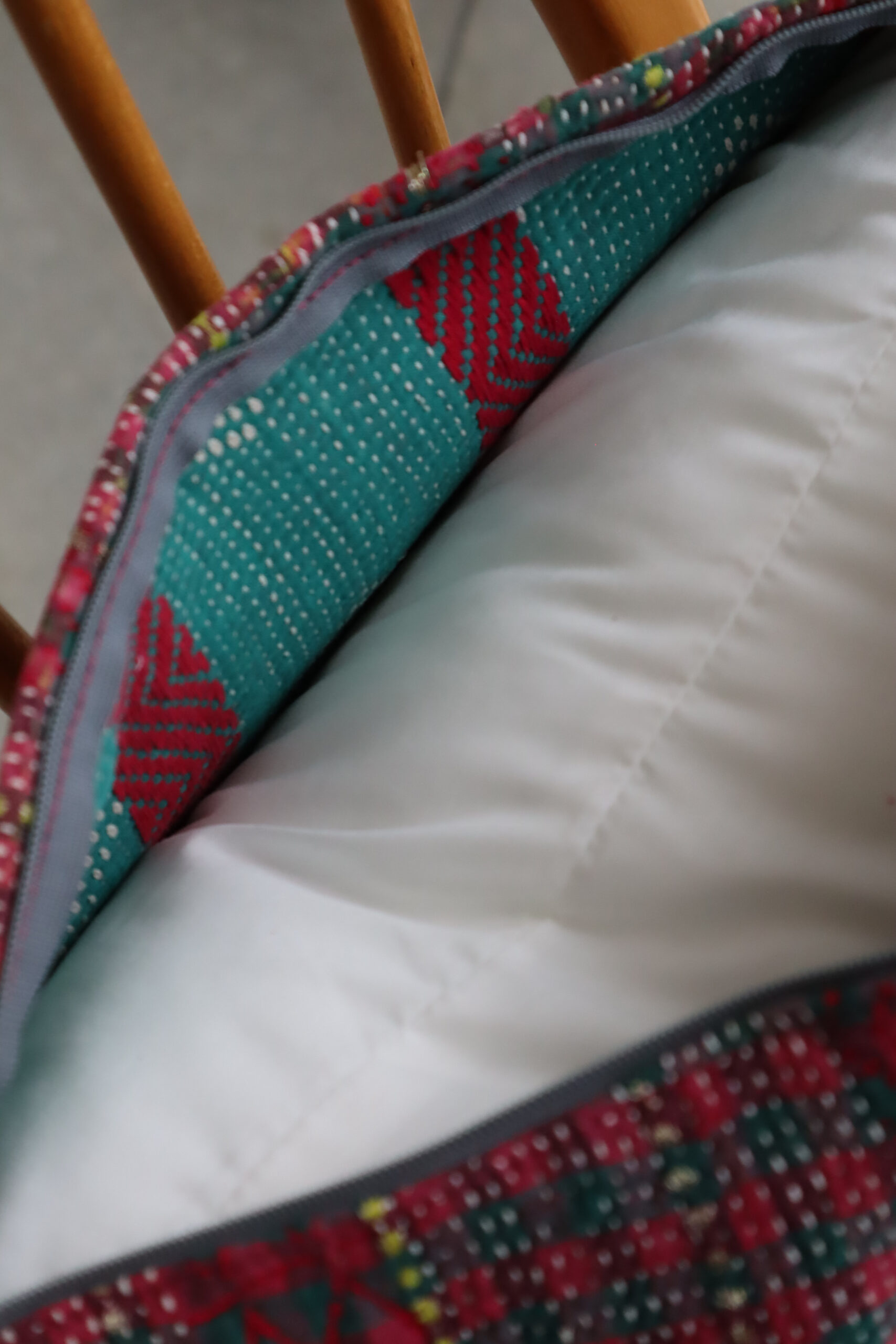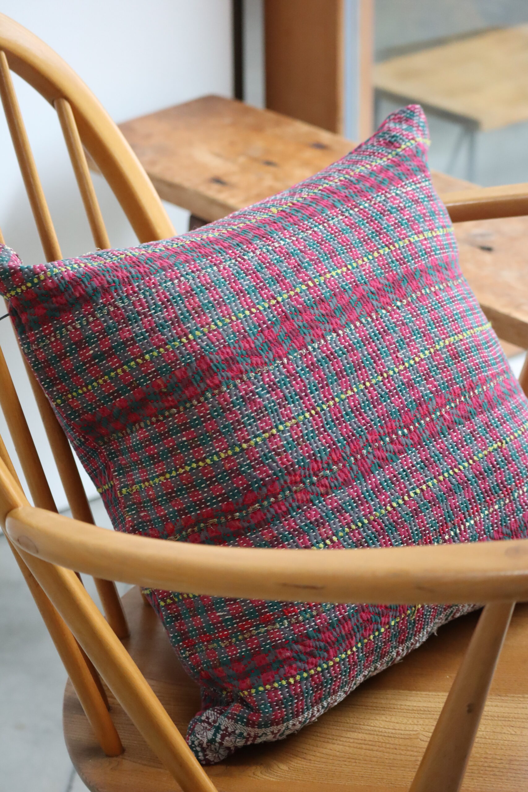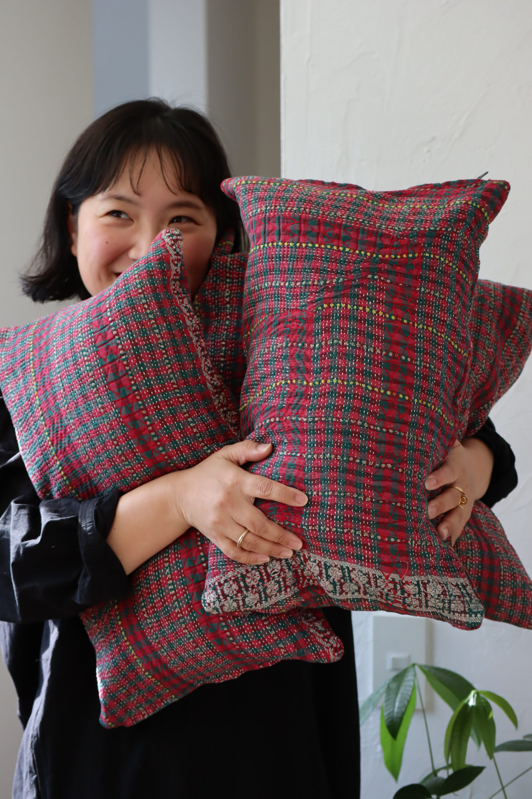 インドはベンガル地方に古くから伝わる伝統技法、KANTHA。古布を繋ぎ合わせ完成させた大判の布はタフで機能的。そんな魅力的な古布でオリジナルクッションを作りました。落ち着いたカラーのチェック柄ですのでインテリアを選びません。洗えるインナークッションとのセット商品です。