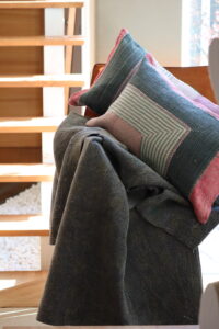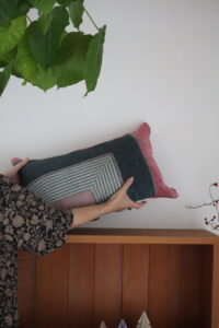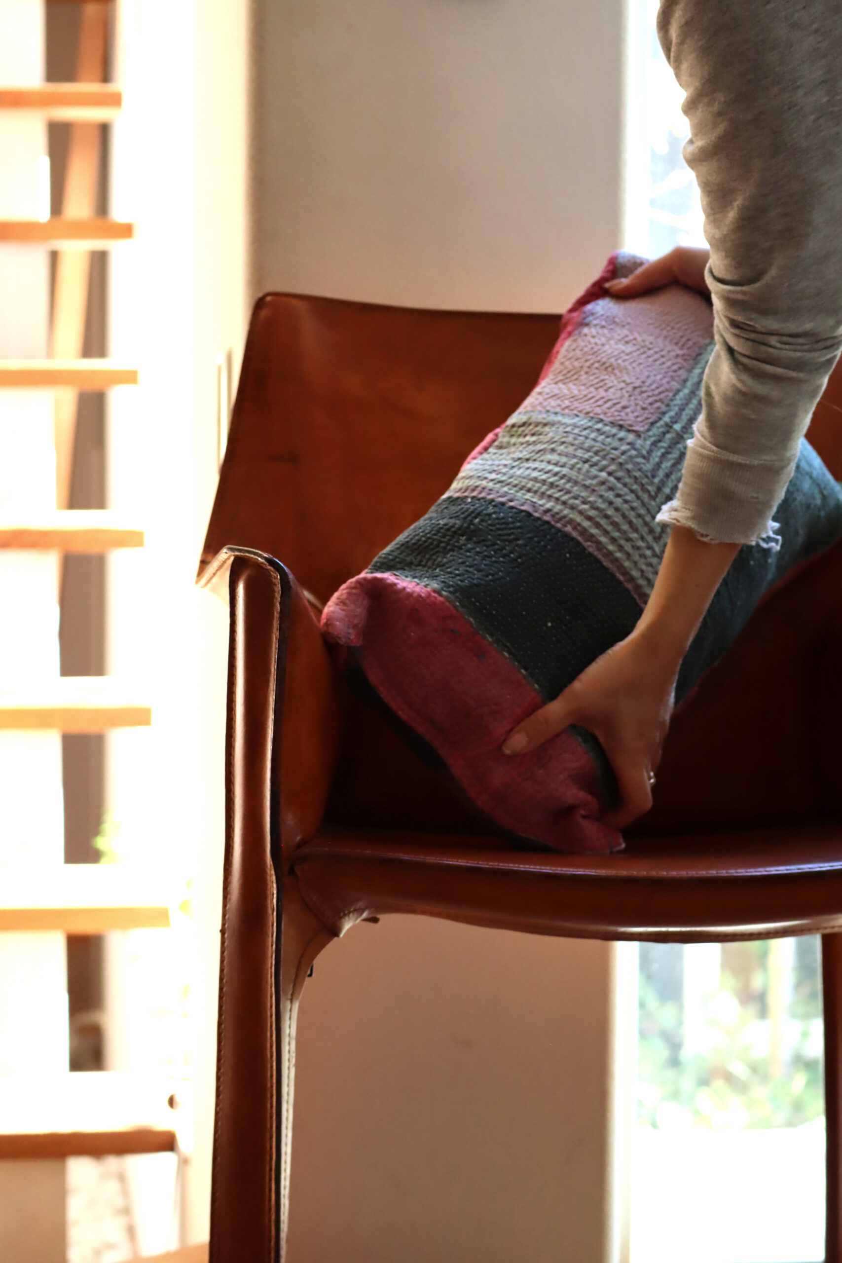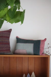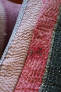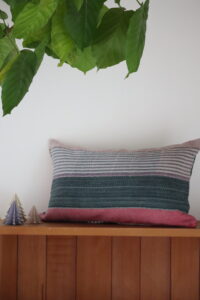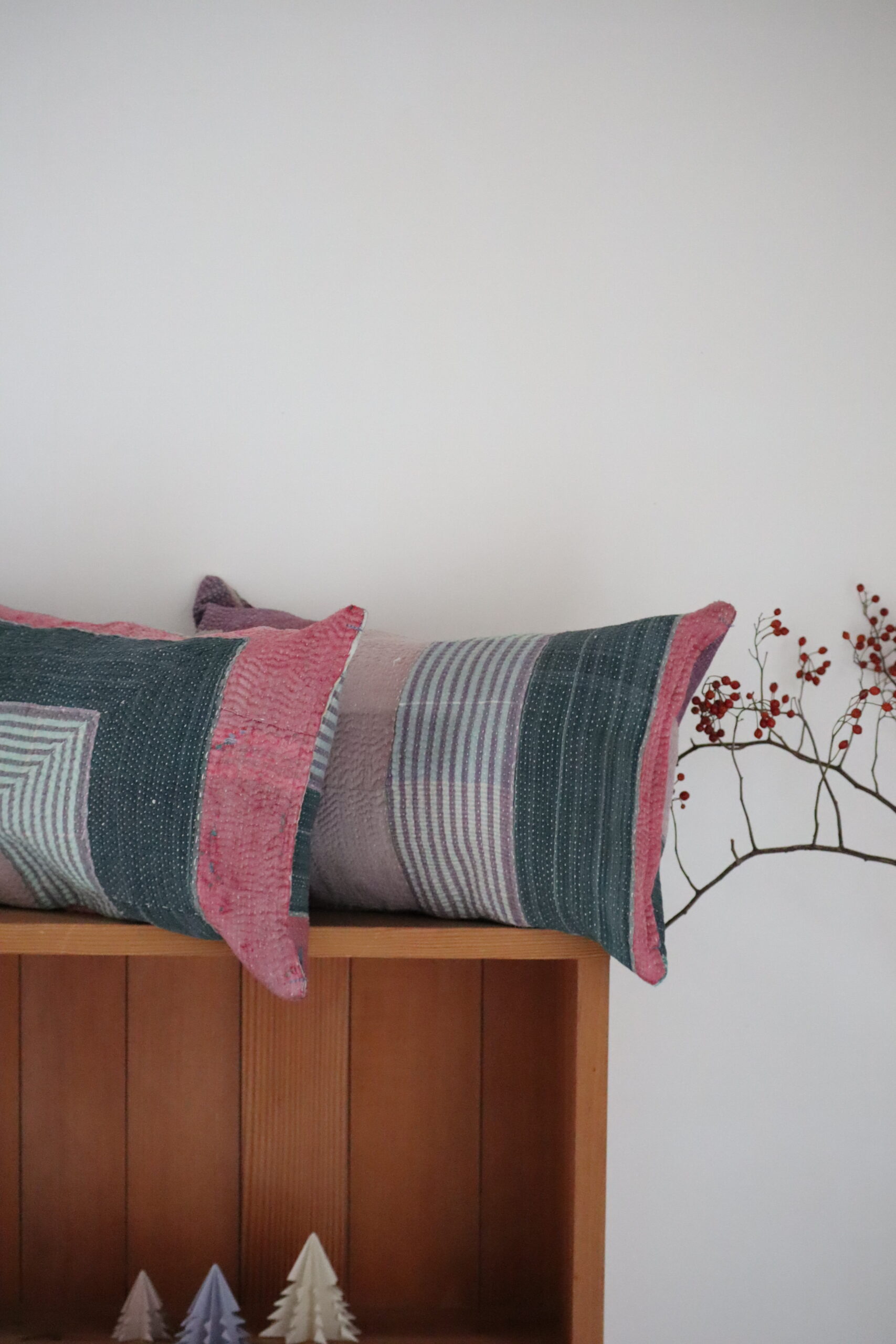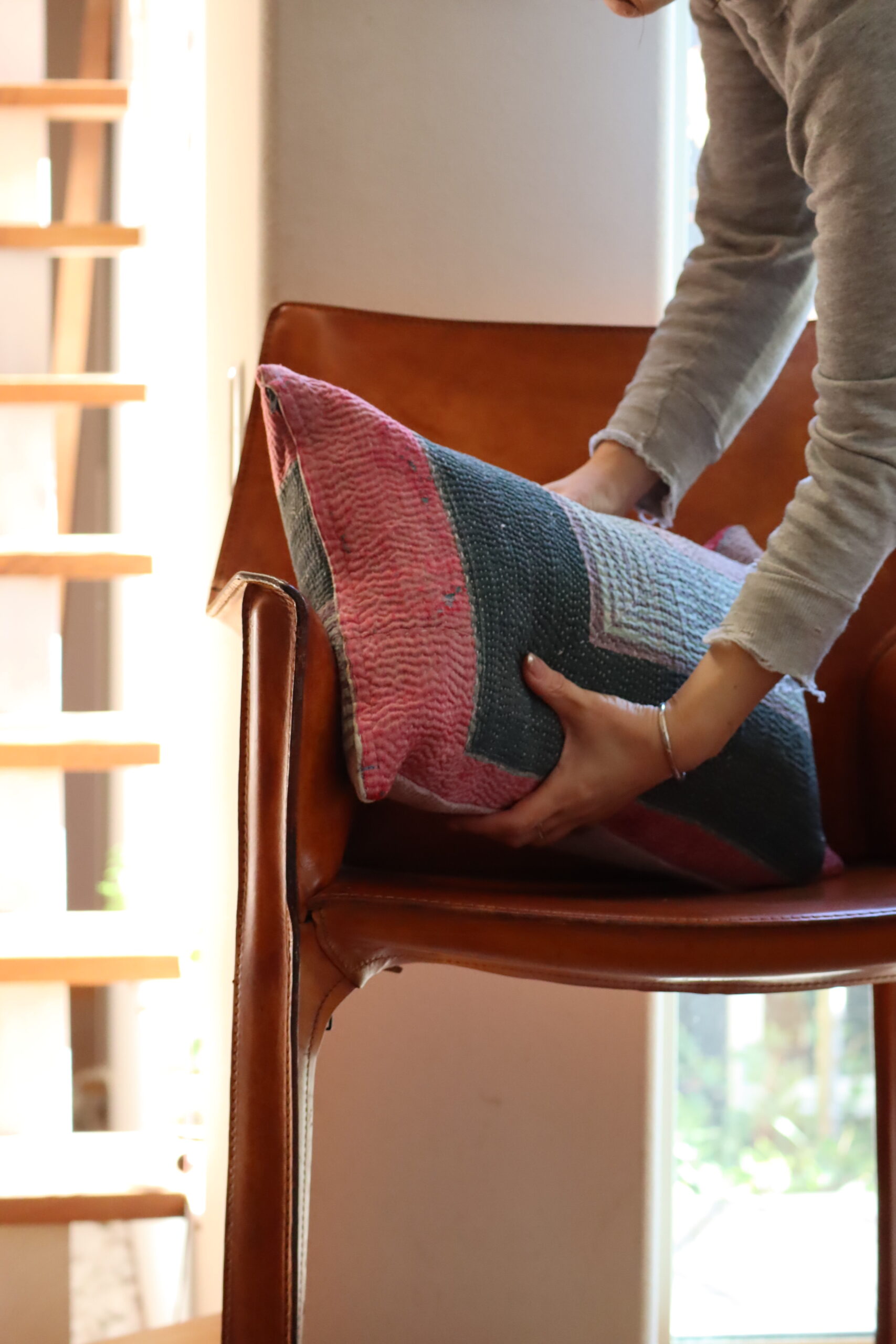 インドはベンガル地方に古くから伝わる伝統技法、KANTHA。古布を繋ぎ合わせ完成させた大判の布はタフで機能的。そんな魅力的な古布でオリジナルクッションを作りました。グレー・ピンクにストライプ、どんなインテリアにも馴染むデザインです。すぐに御使用頂けるように中綿とセットにしてお届けいたします。