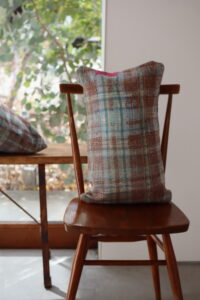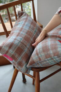 インドはベンガル地方に古くから伝わる伝統技法、KANTHA。古布を繋ぎ合わせ完成させた大判の布はタフで機能的。そんな魅力的な古布でオリジナルクッションを作りました。どんなインテリアにもさらりと馴染む色褪せたブラウンチェック、経年によるヴィンテージ感によりカジュアルになりすぎず取り入れやすいデザインです。こちらには表裏に朱赤のパッチワークが1箇所ずつ入ります。癒やしのアイテムとしてお楽しみくださいね