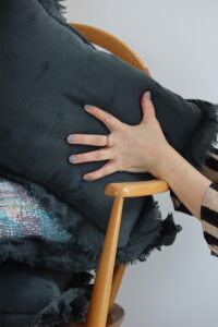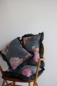 レトロな花柄とフリルデザインがグッとオトナのスタイル。ヴィンテージならではの模様の擦れが唯一無二な良い雰囲気です。背面にはフリルと同色の濃いグレーをセレクトしました。グレーカラーの濃淡も良いバランスで魅力の一つ。こちらはファスナー無しの丸洗いタイプです、むぎゅっと抱きしめたくなるそんな優しいアイテムです。