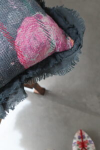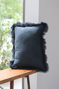 インドはベンガル地方に古くから伝わる伝統技法、KANTHA。古布を繋ぎ合わせ完成させた大判の布はタフで機能的。そんな魅力的な古布でオリジナルクッションを作りました。