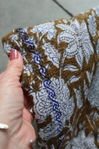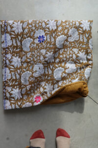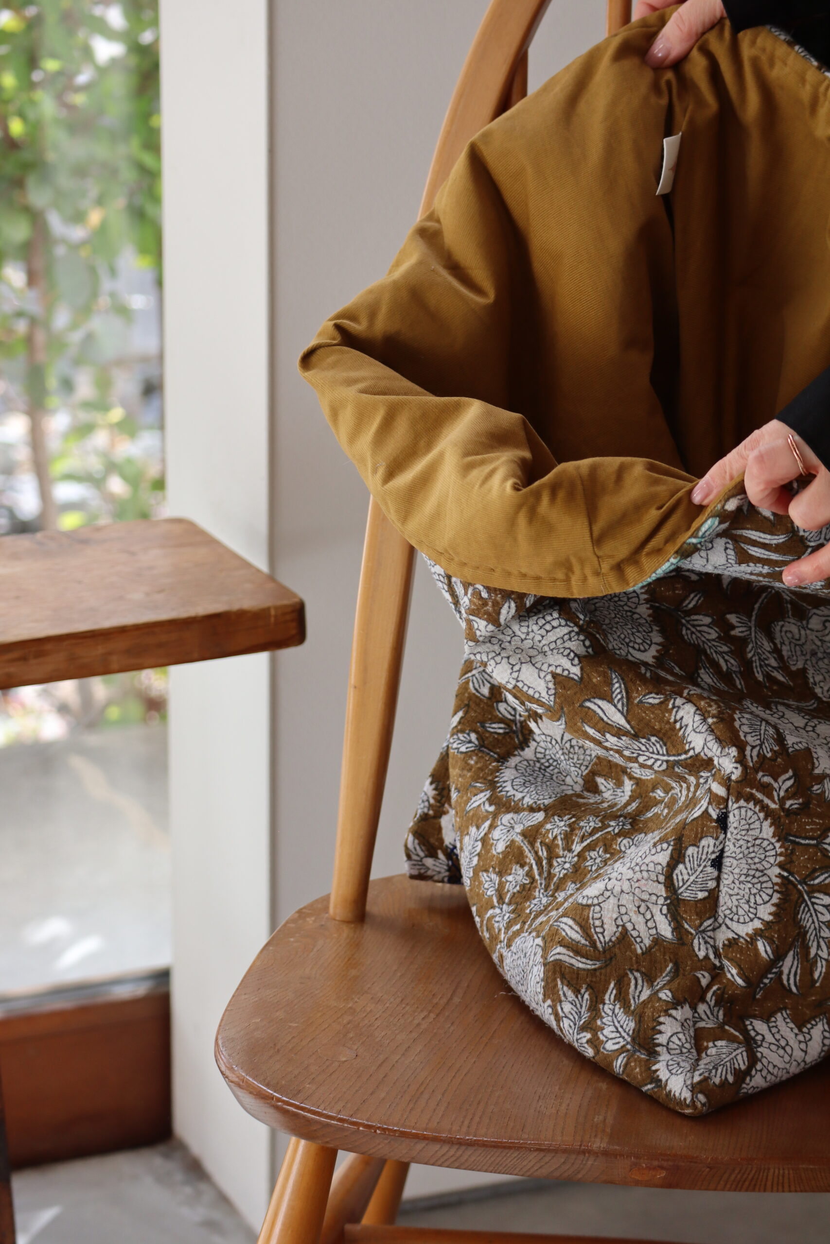 花柄モチーフの木版を用いたハンドブロックプリントカンタと内側に綿が入る綿素材のコールテンを組み合わせています。表裏どちらを主としてもお使いいただけるリバーシブル仕様