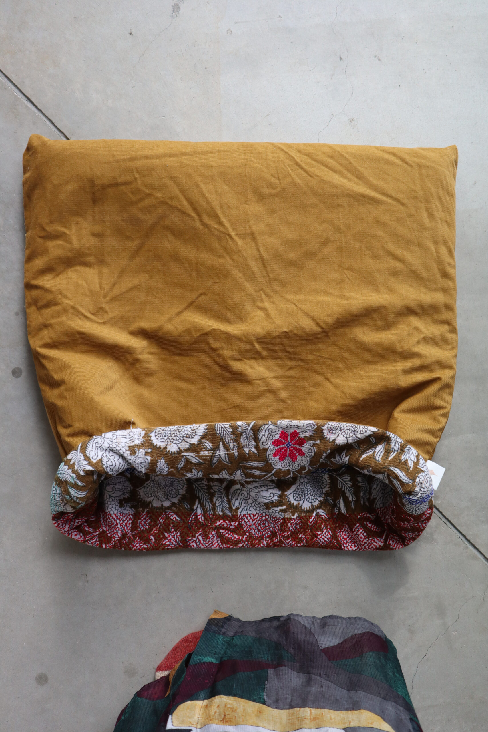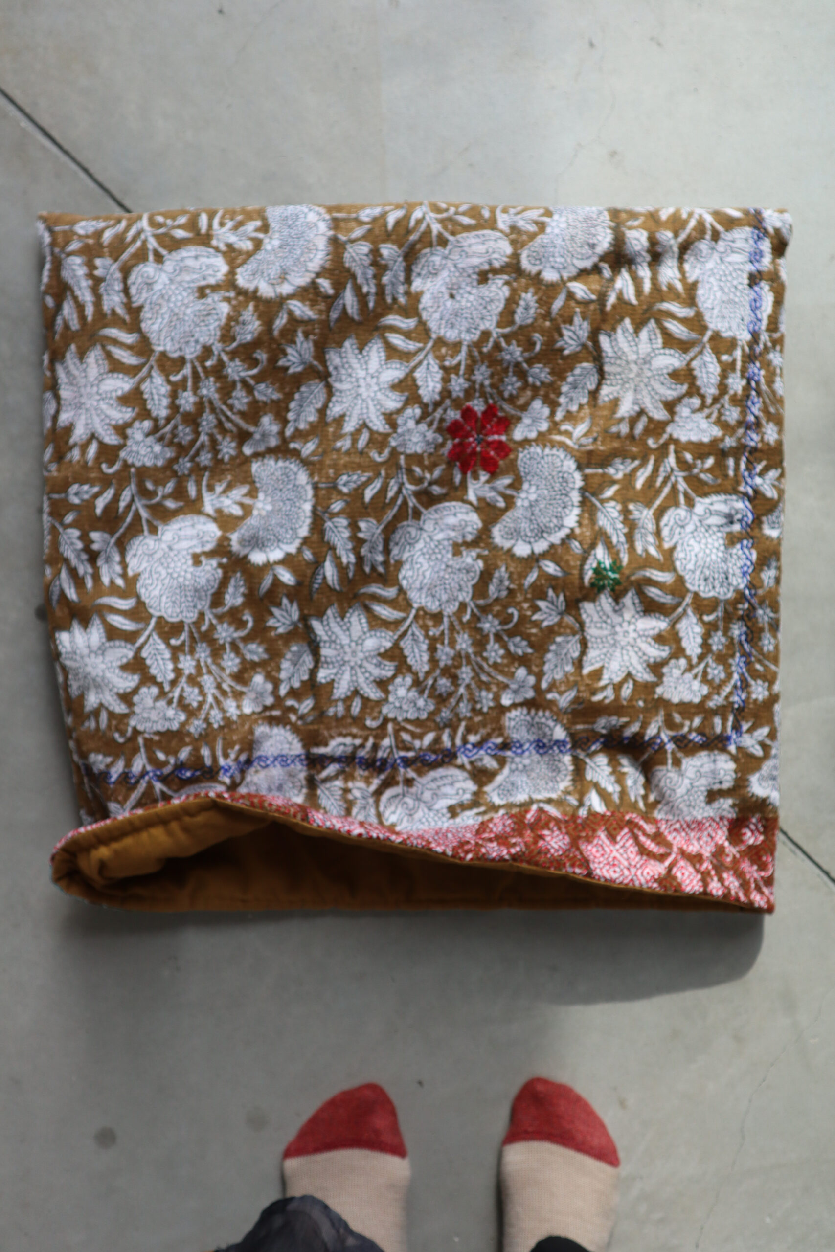 インドはベンガル地方に古くから伝わる伝統技法、KANTHA。古布を繋ぎ合わせ完成させた大判の布はタフで機能的。そんな魅力的な古布でオリジナルアイテムを作りました。