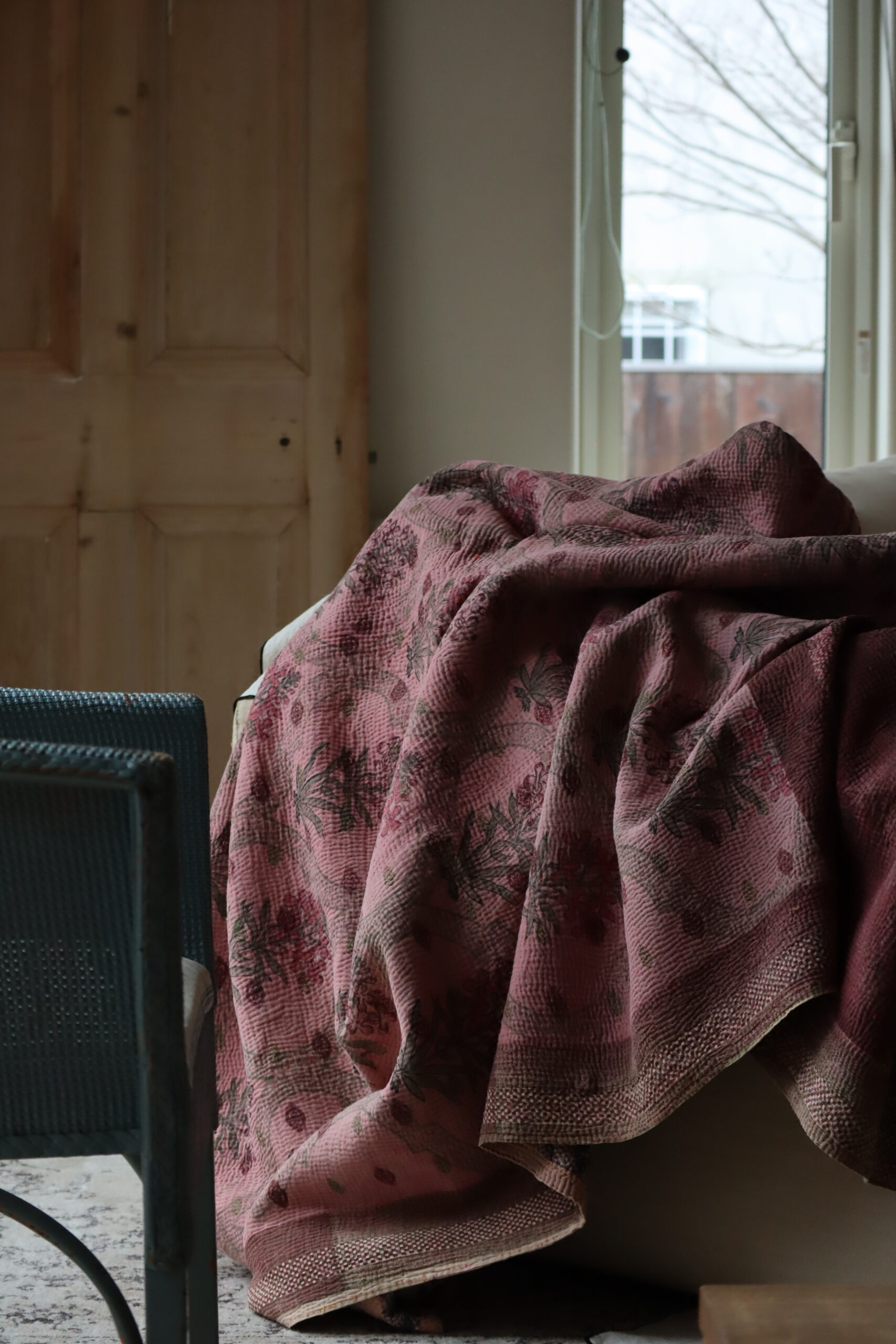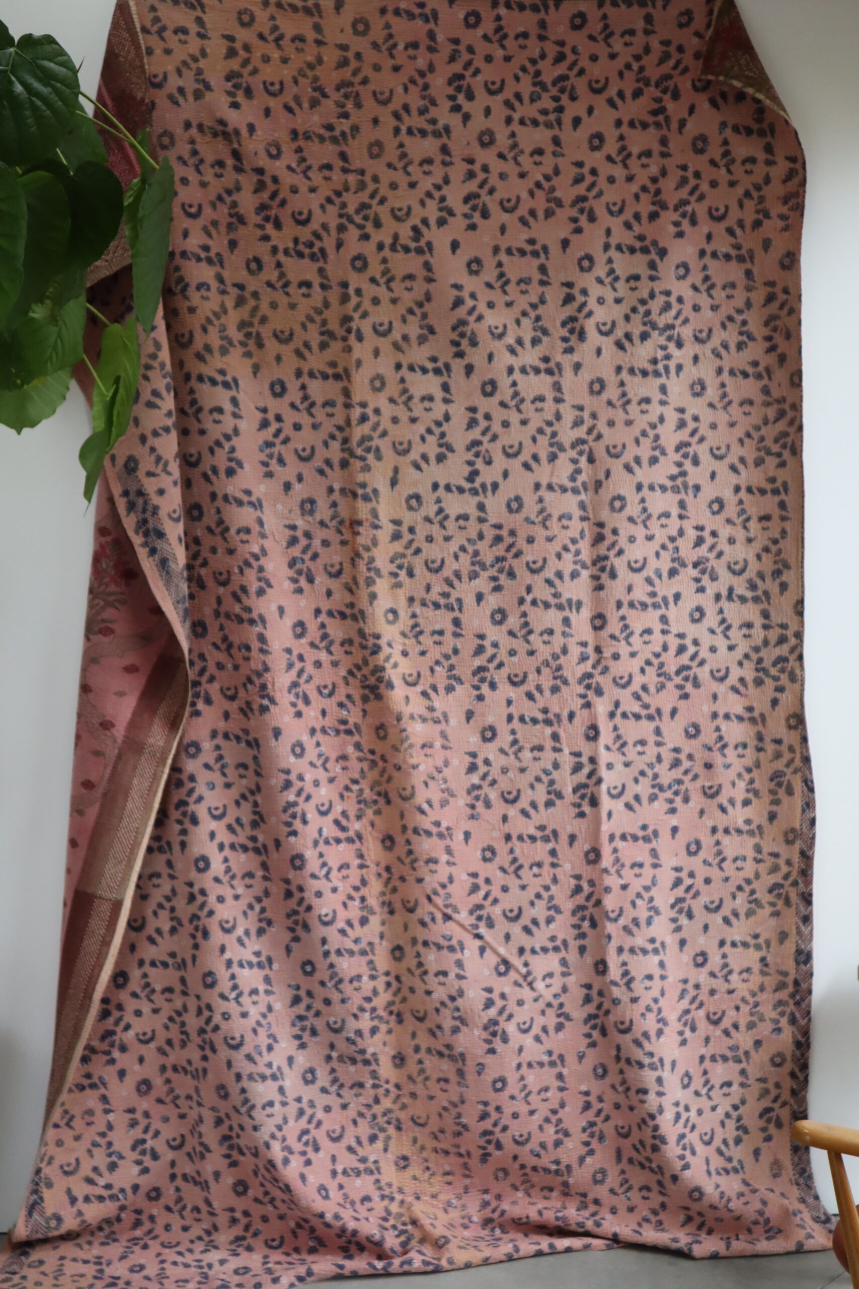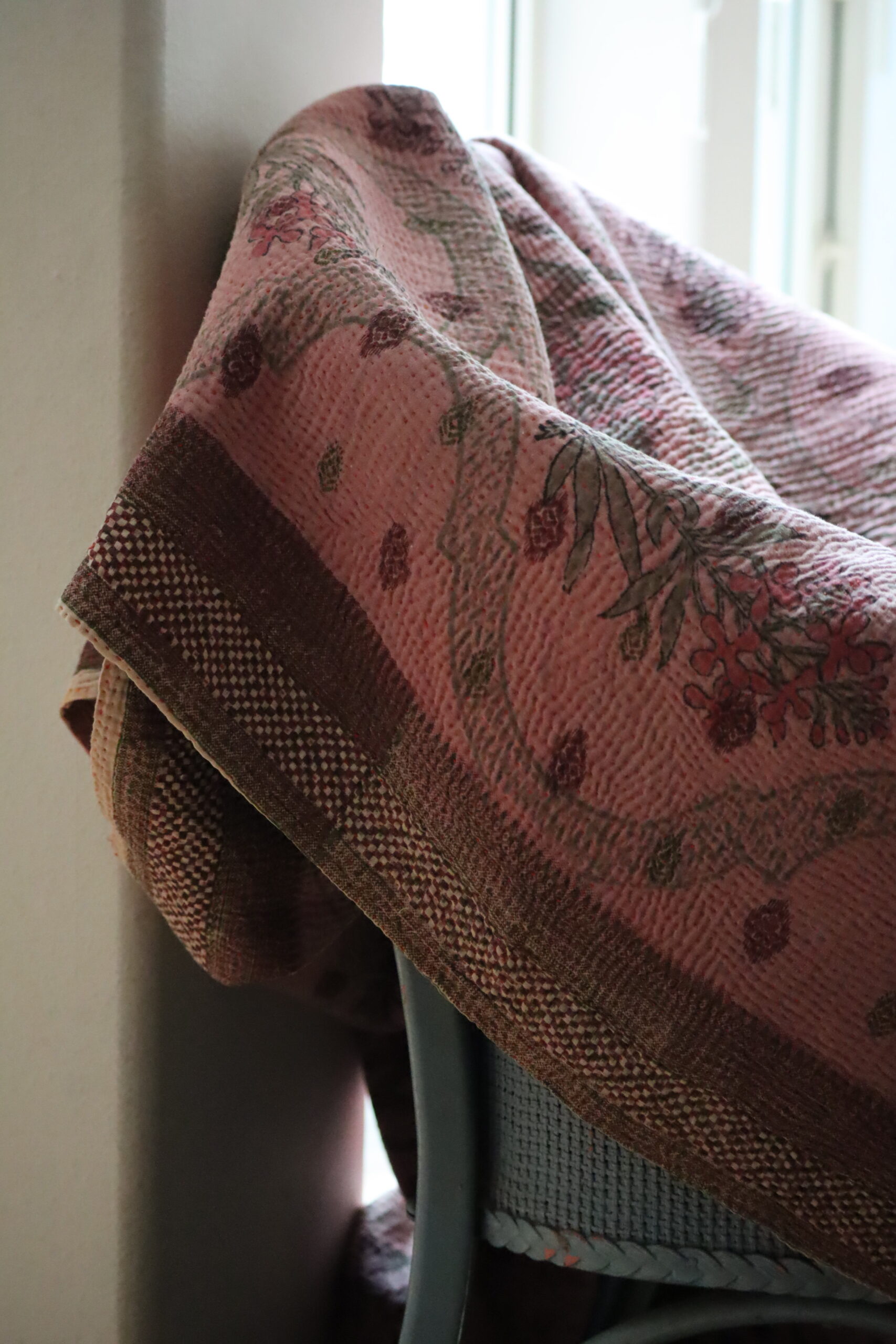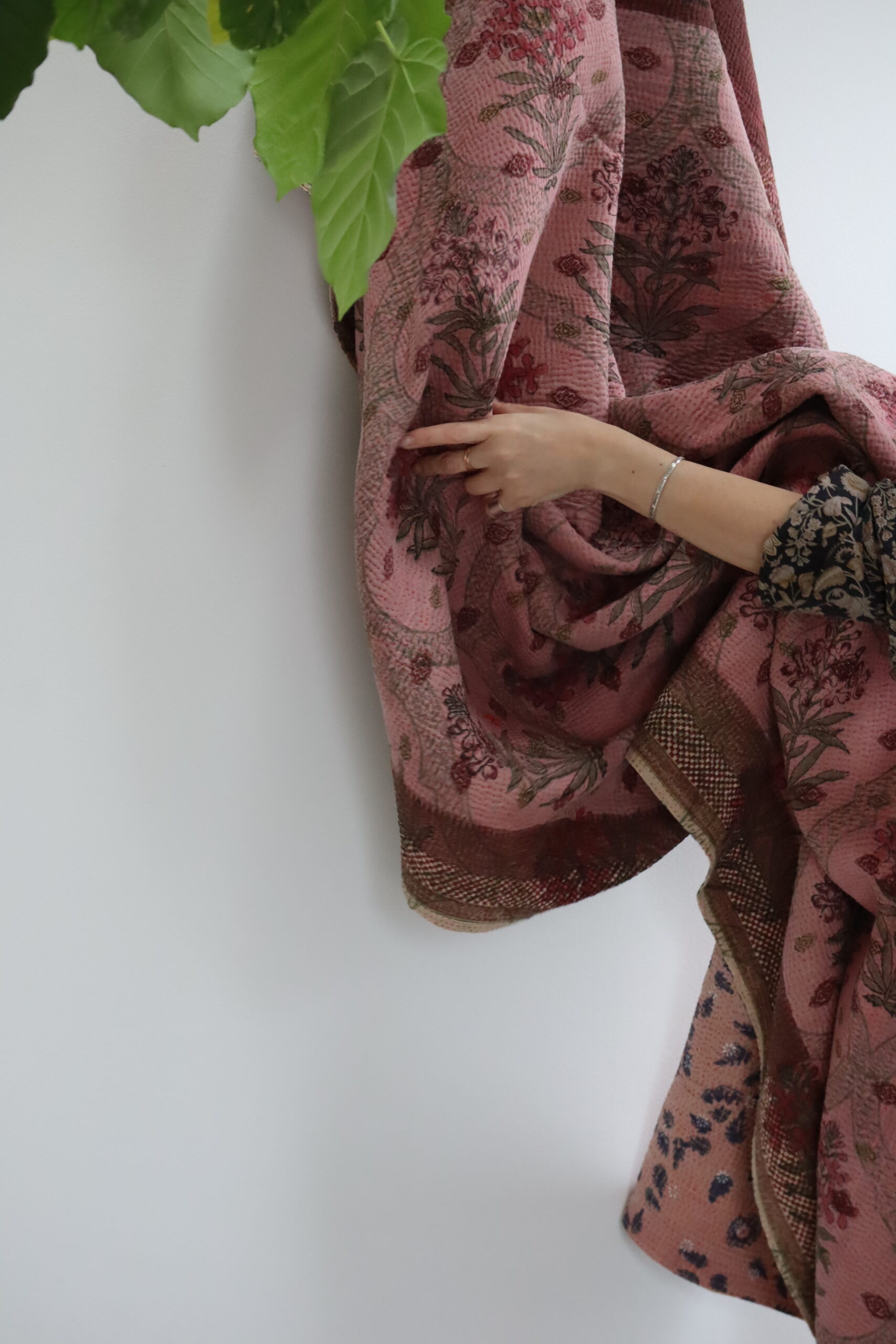 インドはベンガル地方に古くから伝わる伝統技法、KANTHA。古布を繋ぎ合わせ完成させた大判の布はタフで機能的。様々なシーンに取り入れてみてください。表裏両面ともにブロックプリントが施された一枚、仕上げにはピンクブラウンなのか小豆色なのか、シックな色調へと後染めオーバーダイ加工により染まりました。大判サイズを生かしてベッドカバーにもオススメです。質は軽めで状態良好、上掛けや吊るして壁紙のようにもご使用いただけます。
