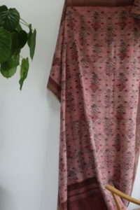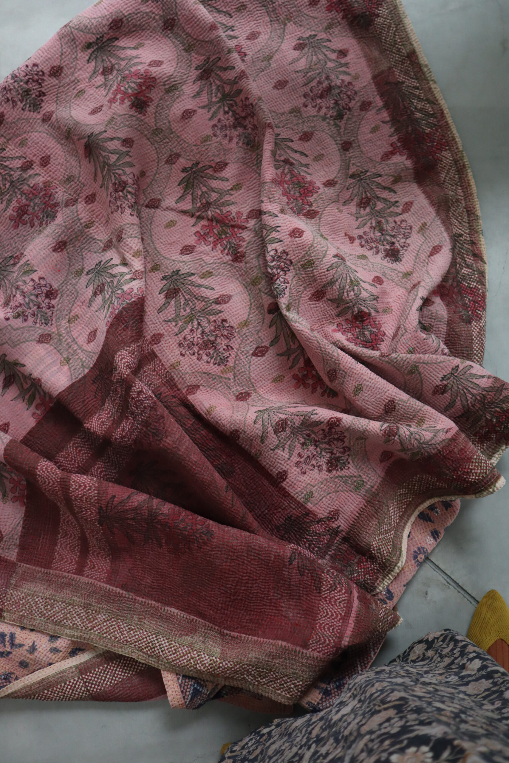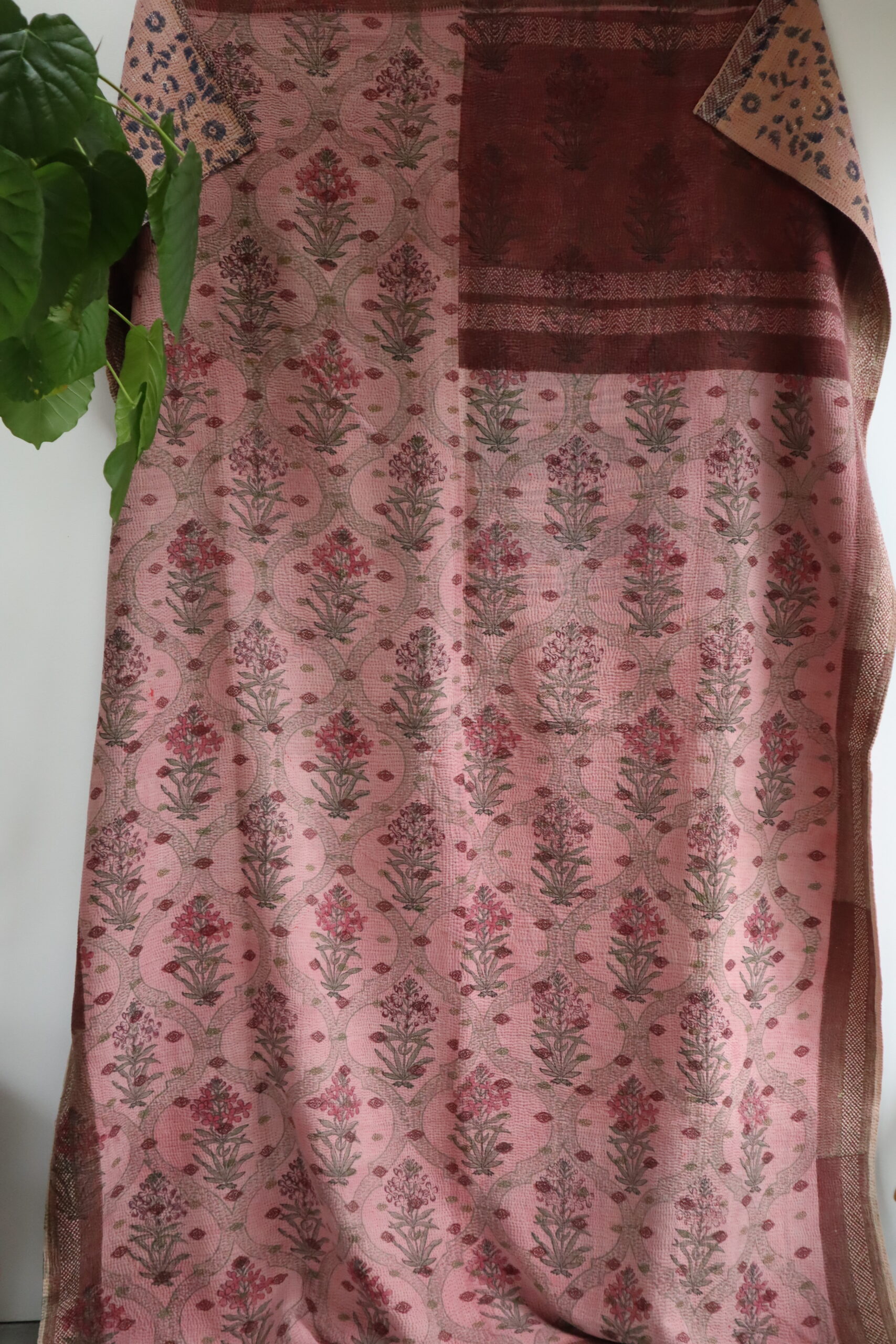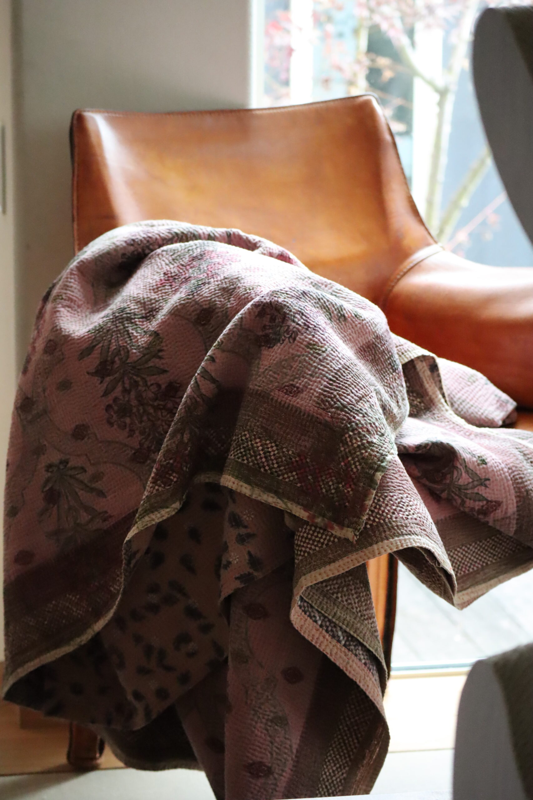 インドはベンガル地方に古くから伝わる伝統技法、KANTHA。古布を繋ぎ合わせ完成させた大判の布はタフで機能的。様々なシーンに取り入れてみてください。表裏両面ともにブロックプリントが施された一枚、仕上げにはピンクブラウンなのか小豆色なのか、シックな色調へと後染めオーバーダイ加工により染まりました。大判サイズを生かしてベッドカバーにもオススメです。質は軽めで状態良好、上掛けや吊るして壁紙のようにもご使用いただけます。