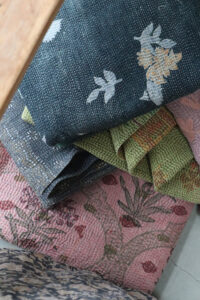 ノスタルジーな雰囲気がお気に入り、完成したカンタをブロックプリンターの手により模様を重ね、仕上げに後染めオーバーダイ加工を施した何度も人の手を入れた特別な一枚です。