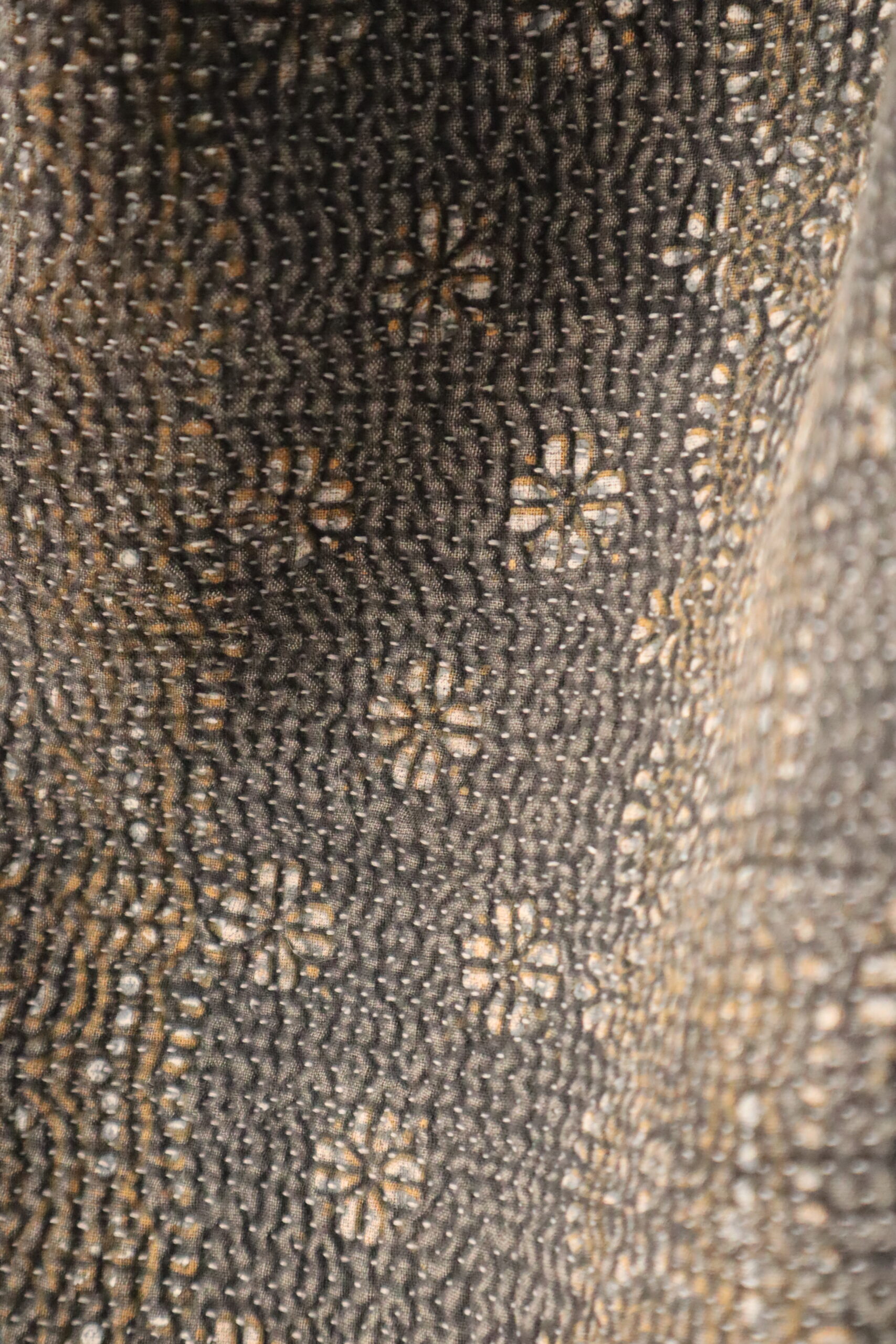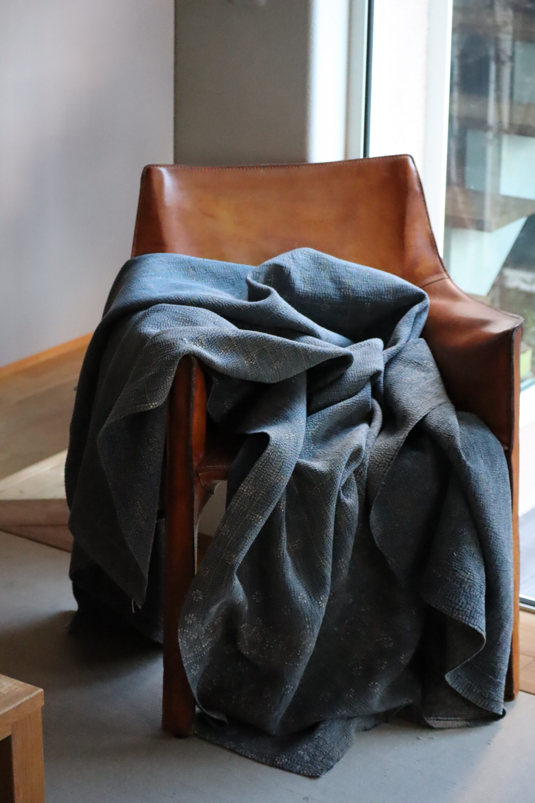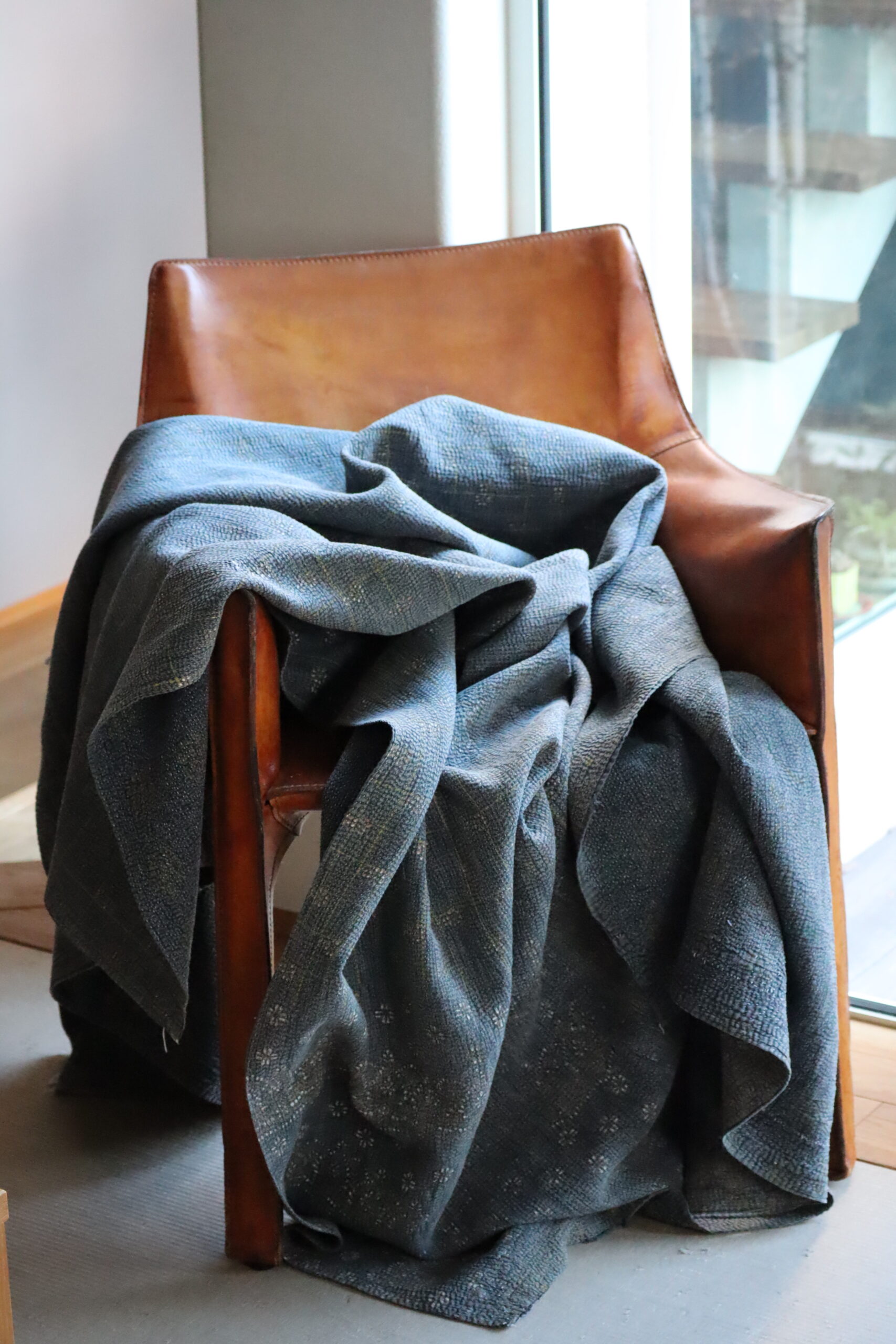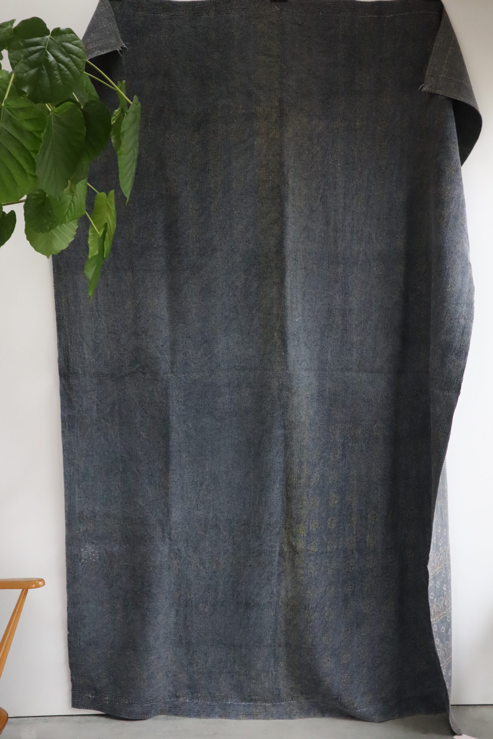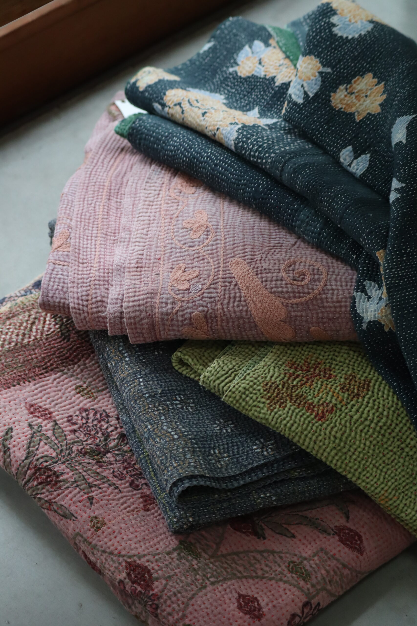 インドはベンガル地方に古くから伝わる伝統技法、KANTHA。古布を繋ぎ合わせ完成させた大判の布はタフで機能的。様々なシーンに取り入れてみてください。両面ともによく見れば模様が浮かび上がる控えめなデザインです。色調は重くなりすぎずこの一枚で洗練された空間に、質は軽く肌なじみも良し、思わず身に纏いたくなるそんな一枚です。