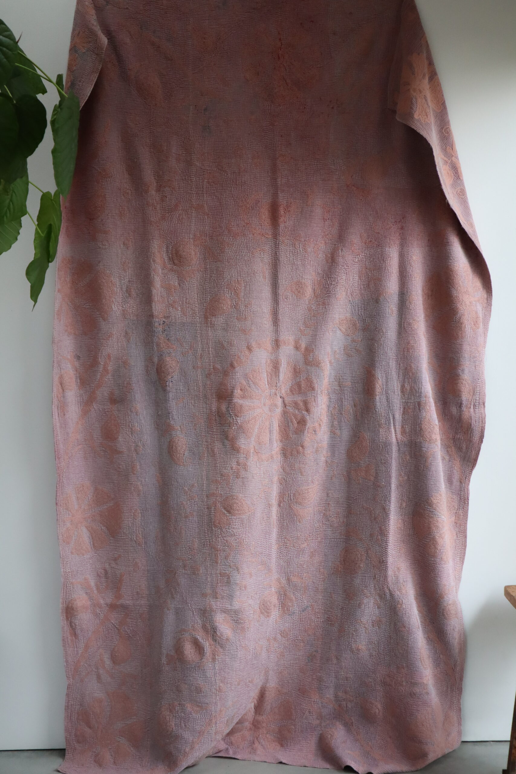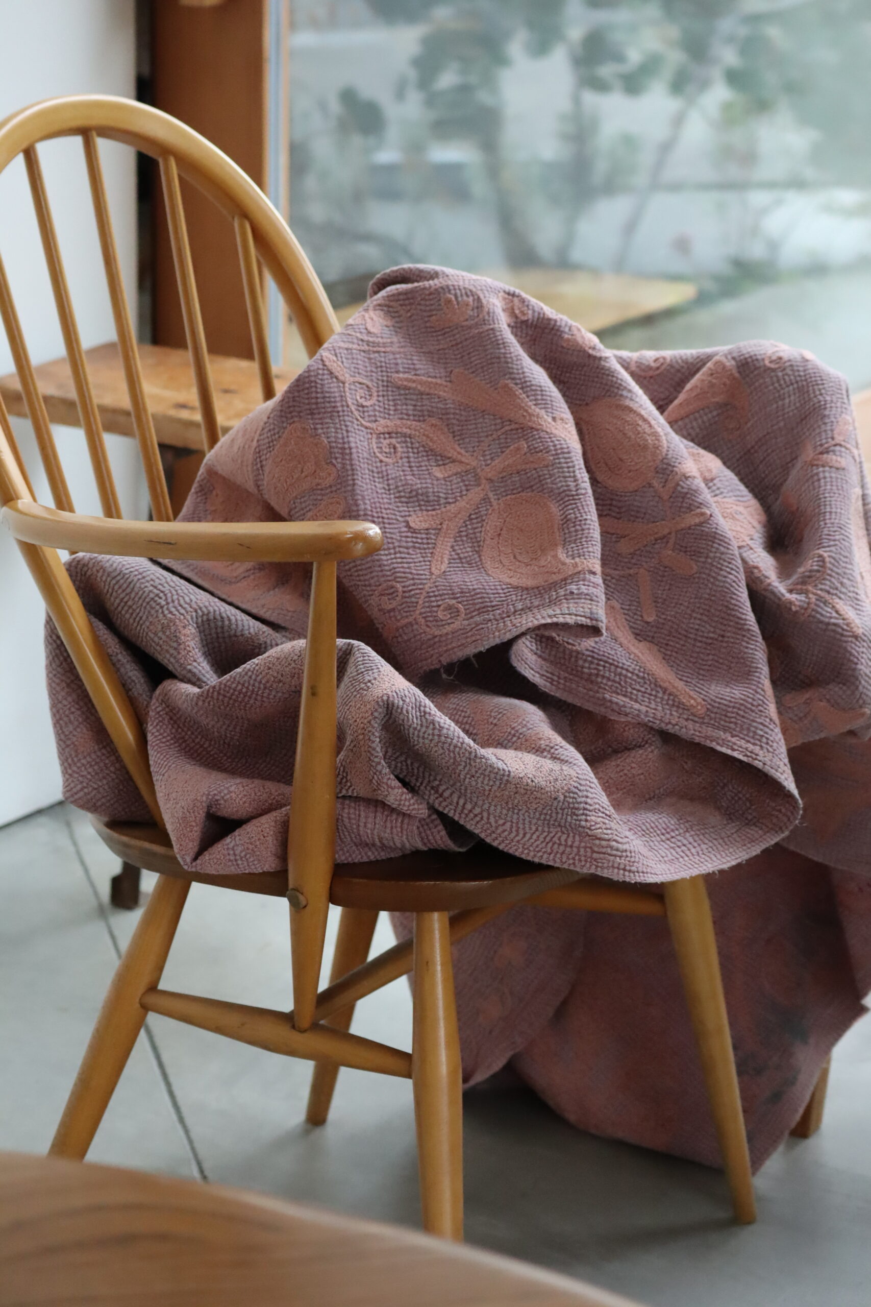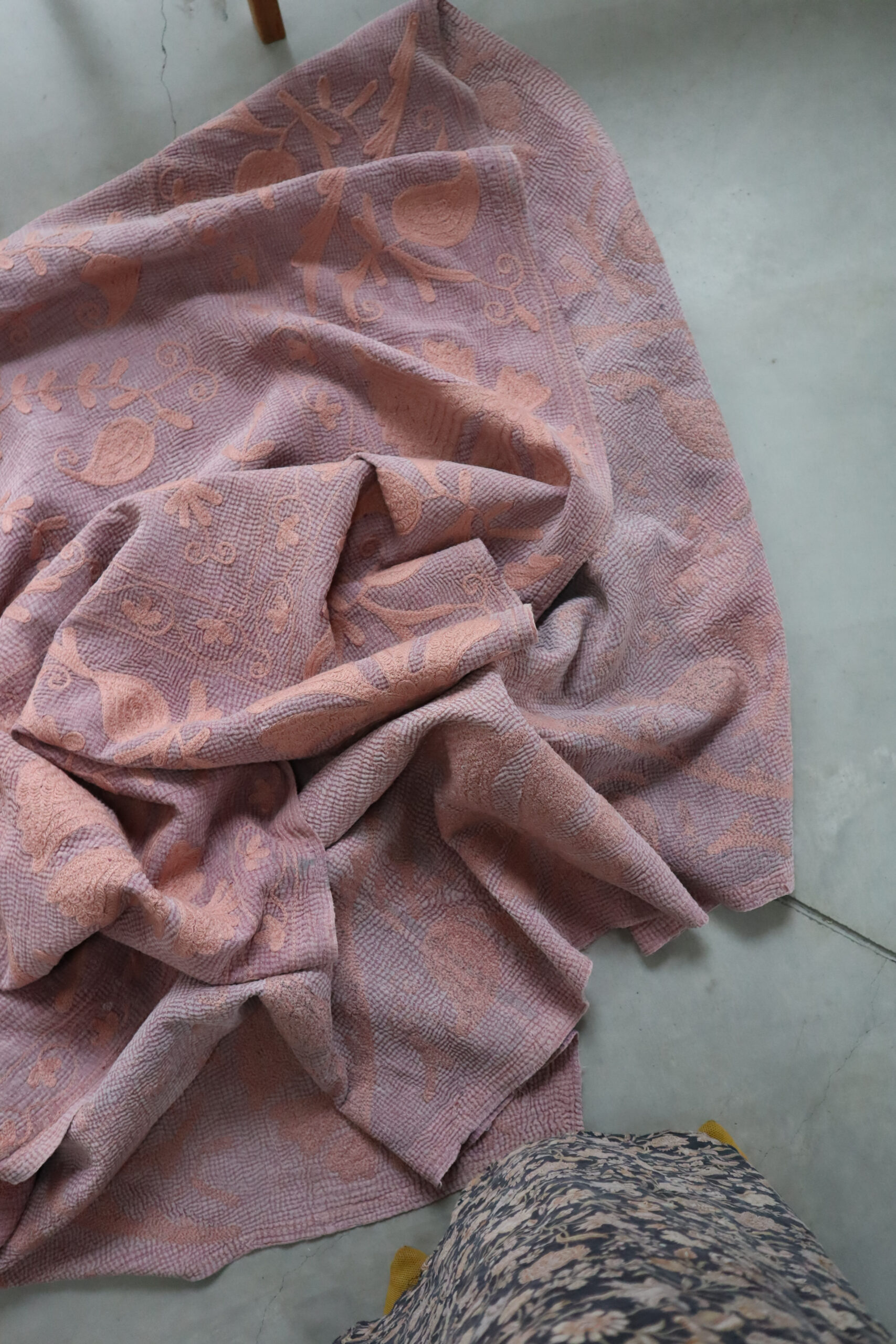 インドはベンガル地方に古くから伝わる伝統技法、KANTHA。古布を繋ぎ合わせ完成させた大判の布はタフで機能的。様々なシーンに取り入れてみてください。ピンクベージュのヌーディーカラーに染まったワントーンスザニカンタ、スザニ刺繍は人の手でくるくると動かすタイプの機械刺繍です。主張しない控えめな印象はベッドカバーにおすすめ。柔らかなインテリアスパイスとして重宝しそうです。