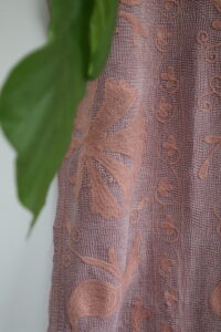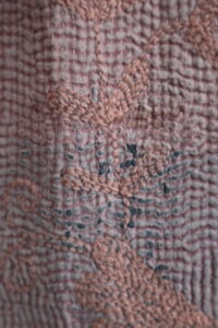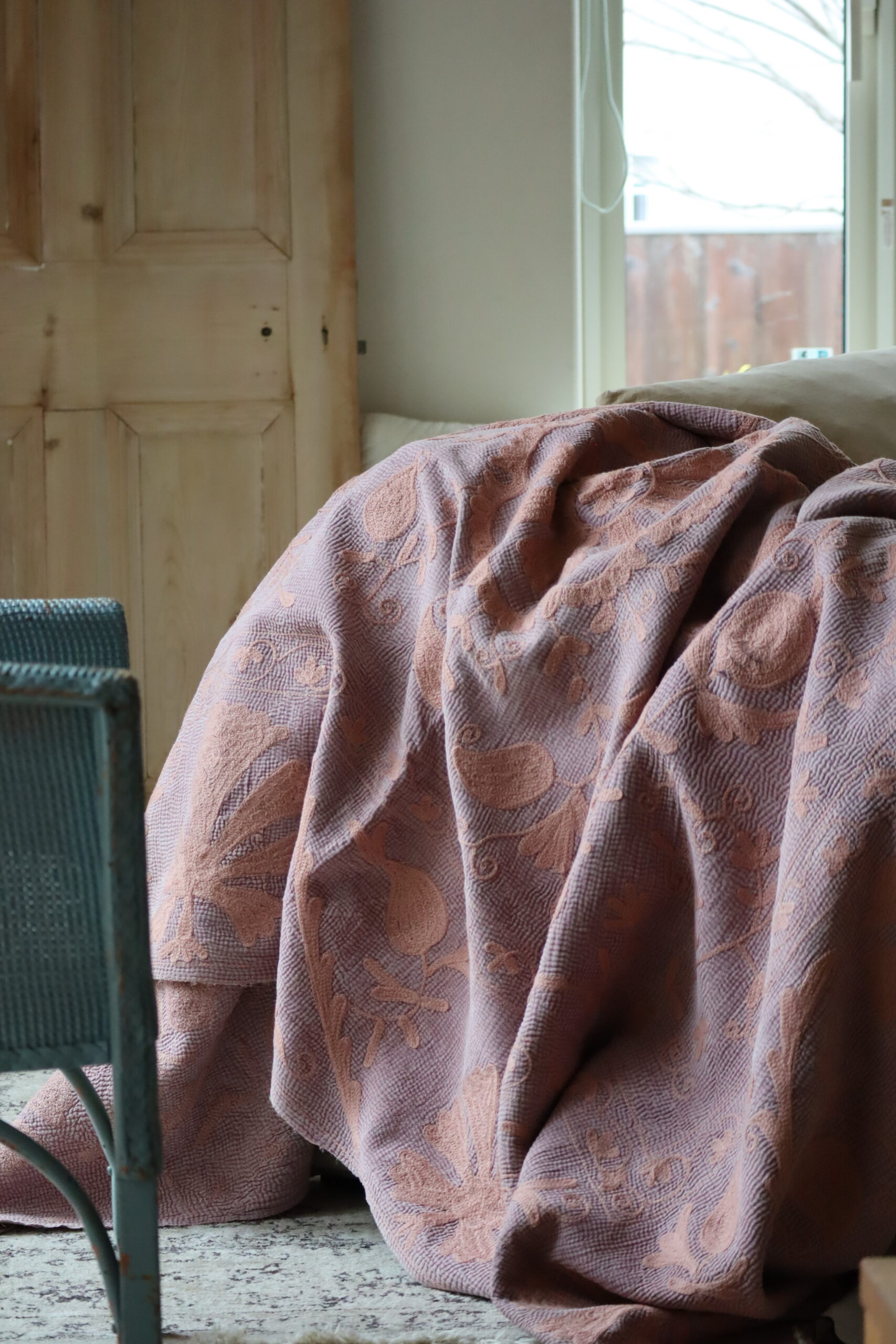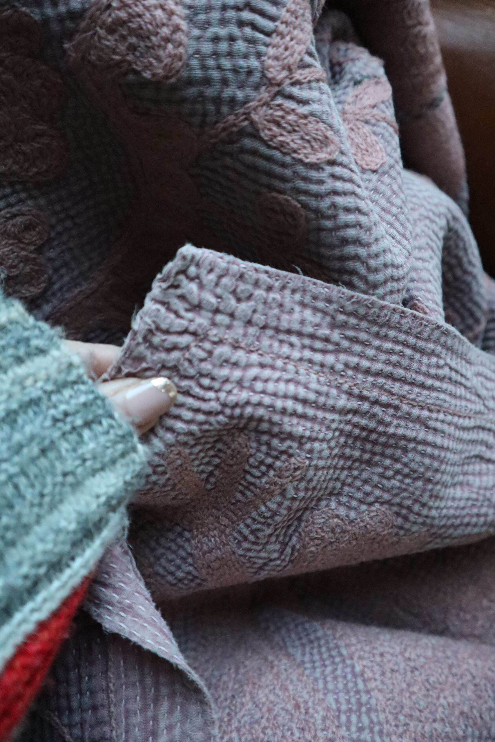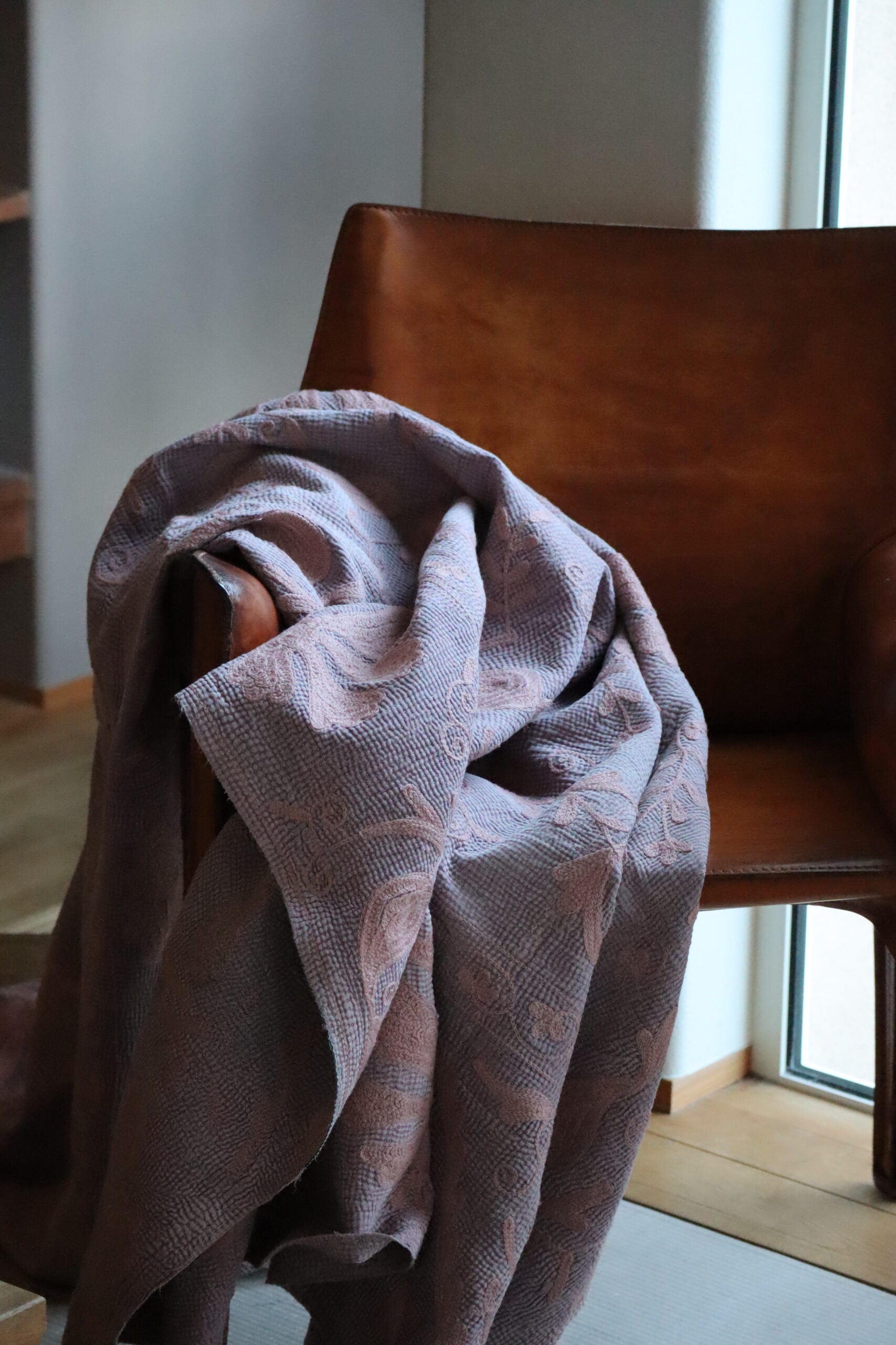 インドはベンガル地方に古くから伝わる伝統技法、KANTHA。古布を繋ぎ合わせ完成させた大判の布はタフで機能的。様々なシーンに取り入れてみてください。ピンクベージュのヌーディーカラーに染まったワントーンスザニカンタ、スザニ刺繍は人の手でくるくると動かすタイプの機械刺繍です。主張しない控えめな印象はベッドカバーにおすすめ。柔らかなインテリアスパイスとして重宝しそうです。