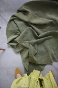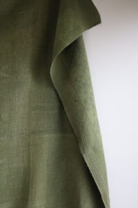 なんと言っても画像から伝わるとろける滑らかさが魅力のカンタ、後染めにより鶯色へとこっくり均一に染まりました。単色ながらも地模様が薄っすらと垣間見れます。小さなダーニングはチャームポイント